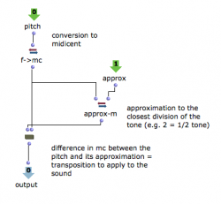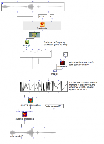 | During this session we have tried to implement a kind of "auto-tuner" process, that would correct the pitch of a sound to the closest intonation of a given scale. In theory, the solution is actually pretty simple ! The following visual program approximates a pitch to the closest tempered division of the octave (approx-m), and returns the difference with the original pitch, that is, the required transposition to reach this approximated pitch: ![]() We can therefore apply it in a patch similar to the previous one (inspired from the "remove-pitch" example). ⇒ Download the patch: auto-tune.omp You can test this patch with simple sounds (e.g. a frequency-modulated sine) and check that the frequency is now fixed to the pitches in the specified approximation (try out this patch to synthesize the initial sound using OMChroma and OM-SuperVP, for instance). With "real" sounds (e.g. with quick pitch variations), the result may not sound so good : a real, good solution may actually require more advanced and case specific settings/processing. | ![]() |