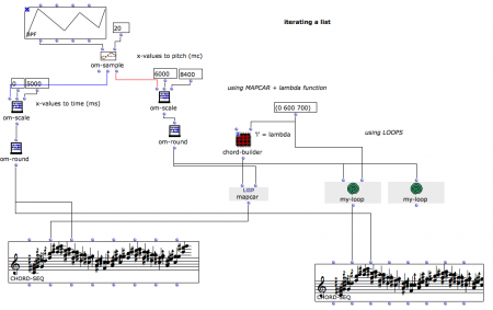 - Using the basic OM functions to create musical data (om-random, om-scale, om-sample, om+, om-round, x→dx/dx→x, etc.)