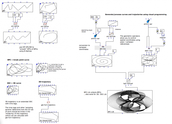 | New objects for the manipulation of curves and trajectories: BPC, 3DC, 3D-trajectory. Examples of algorithmic generation of trajectories, coordinate-system conversions. The BPC-lib and 3DC-lib objects allow to collect lists of BPCs or 3DCs. Download the patch: curves-1.omp. | ![]() |