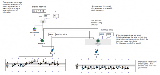 | ⇒ In this practical examples we implemented a solution using OMLoop, to generate a sequence out of randomly selected intervals, that would remain in a given pitch range. Download the patch: ex-random-intervals.omp | ![]() |