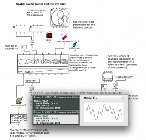 | OM-Spat and the SPAT-MATRIX object allow to represent spatial scenes. Every component (column of the matrix) represents one source and its different spatial parameters. The spatial scene can be rendered to a multichannel audio file with spat-synth, or saved as an SDIF file. Room parameters can also be specified in the SPAT-ROOM objects, that can be attached to the different sources. Download the patch: om-spat.omp Note: similar matrices to the SPAT-MATRIX are also used for controlling sound synthesis processes in other libraries, such as OMChroma and OMPrisma, or OM-Chant. They are all subclasses of a standard OM object called class-array. | ![]() |