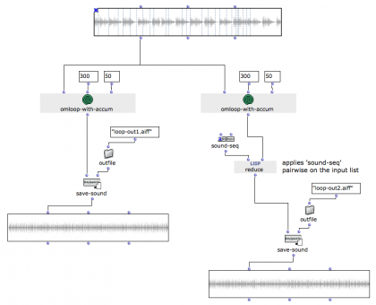 | An example of audio iteration. In this second patch we embedded the audio functions in an iterative patch (omloop) which selects a random position in the file and cuts a small extract (sound-cut), repeats this process a number of times, and appends the extracts into a single sound (sound-seq). In order to implement this loop, we used the accum box instead of the collect, so as not to collect the extracts into a list, but defined our own "collection" procedure using sound-seq. We also implemented an alternative solution using collect and the reduce Lisp function. Download the patch: sound-loop.omp | ![]() |