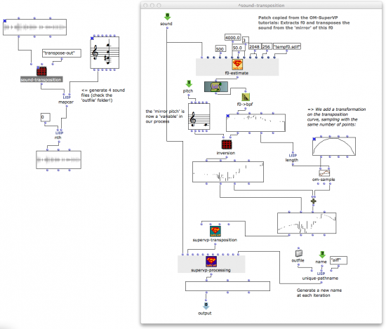 | Analysis/synthesis, batch processing. In this patch we started from the 'remove-pitch' example from the OM-SuperVP library tutorials and added additional treatments on the transposition. We then embedded the whole patch in an iteration (mapcar) performed on a list of mirror pitches. Download the patch: sound-processing-iteration.omp | ![]() |