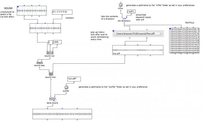 | Sound montage, mixing and processing. - Sound processing boxes: sound-seq, sound-cut, sound-save. - How to instantiate a sound from a pathname, select from pathnames in your file system… Download the patch: sound.omp | ![]() |