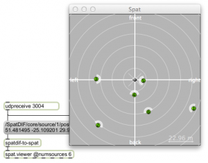 | The OSC/SpatDIF messages can be received for instance in Max using udpreceive (set the port to th Spat-SDIF-Player output port). The Ircam Spat 4 includes a spatdif-to-spat utility to convert SpatDIF to Spat messages. | ![]() |
