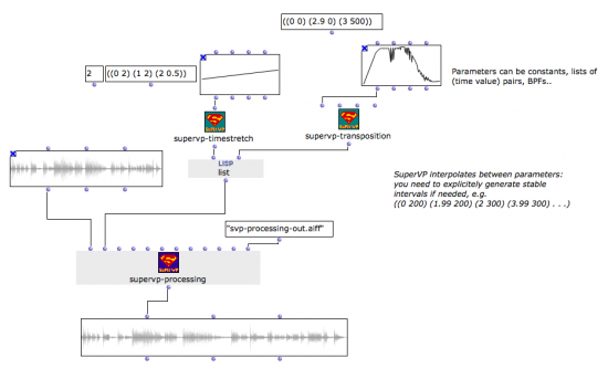 | Overview of the sound processing tools in OM-SuperVP. Review of some of the different treatments available for supervp-processing (transposition, time-stretching,…) and different ways of setting the parameters (constant, continuous, etc.) Download the patch: supervp-processing.omp | ![]() |