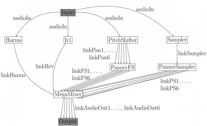 The audio graph associated to the piece Anthèmes 2 by Pierre Boulez.