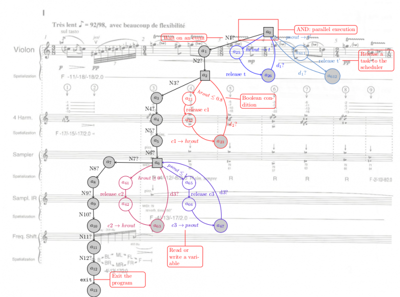 - Static analysis of the scores, to find some bounds (on the tempo for instance) so that a score is playable or to extract a graphical representation, as a score on a timeline