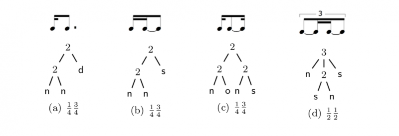 Examples of rythms with slurs and dots and their tree representation.