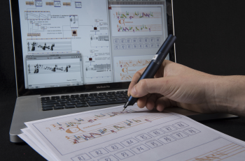 Pen stokes and gestures were transmitted to the computer-aided composition environment and used to generate or process musical material. Reactive OM processes provided immediate visual feedback (in score editors) as well as audio rendering of compositional processes while sketching and drawing shapes on paper.