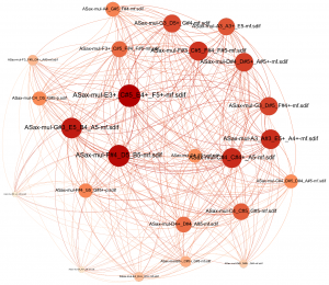 N.B. For both graphs, nodes sizes and colours = average weighted degree; larger and darker = high degree, and vice versa.