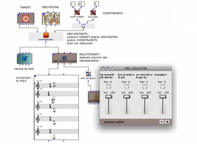 The Orchidée prototype was originally developed in Matlab. It included a set of graphical user interfaces (GUIs) but had a limited and non-extendible musical instrument knowledge. Today, Orchidee is a compiled standalone application server that communicates with client interfaces through OSC messages. Thus, Orchidée allows an easy and flexible control from traditional computer music environments such as OpenMusic or Max/MSP. Another key feature is that the musical knowledge provided with Orchidée may be easily generalized and extended by the user. However, the GUIs have now moved to the client side and are no more delivered with the application.